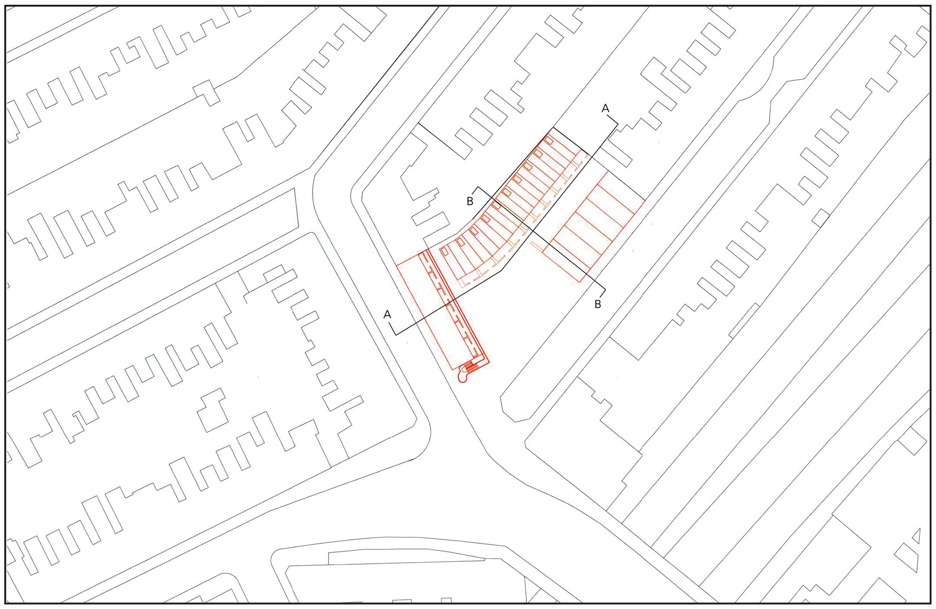 Hand-drawn section through shared and individual housing